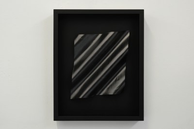 to the worth and beauty in the seemingly worthless. At the same time she questions society’s expectations and the pressure to be a certain way. Themes of perfectionism are echoed again in the two pieces Nerves and Tarnished. Positioned opposite each other in the space, they allude to mirrors (they are the same size as mirrors) these two works appear to be made of a hard metal but are, in fact, painstakingly drawn with graphite pencil on waved paper.