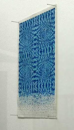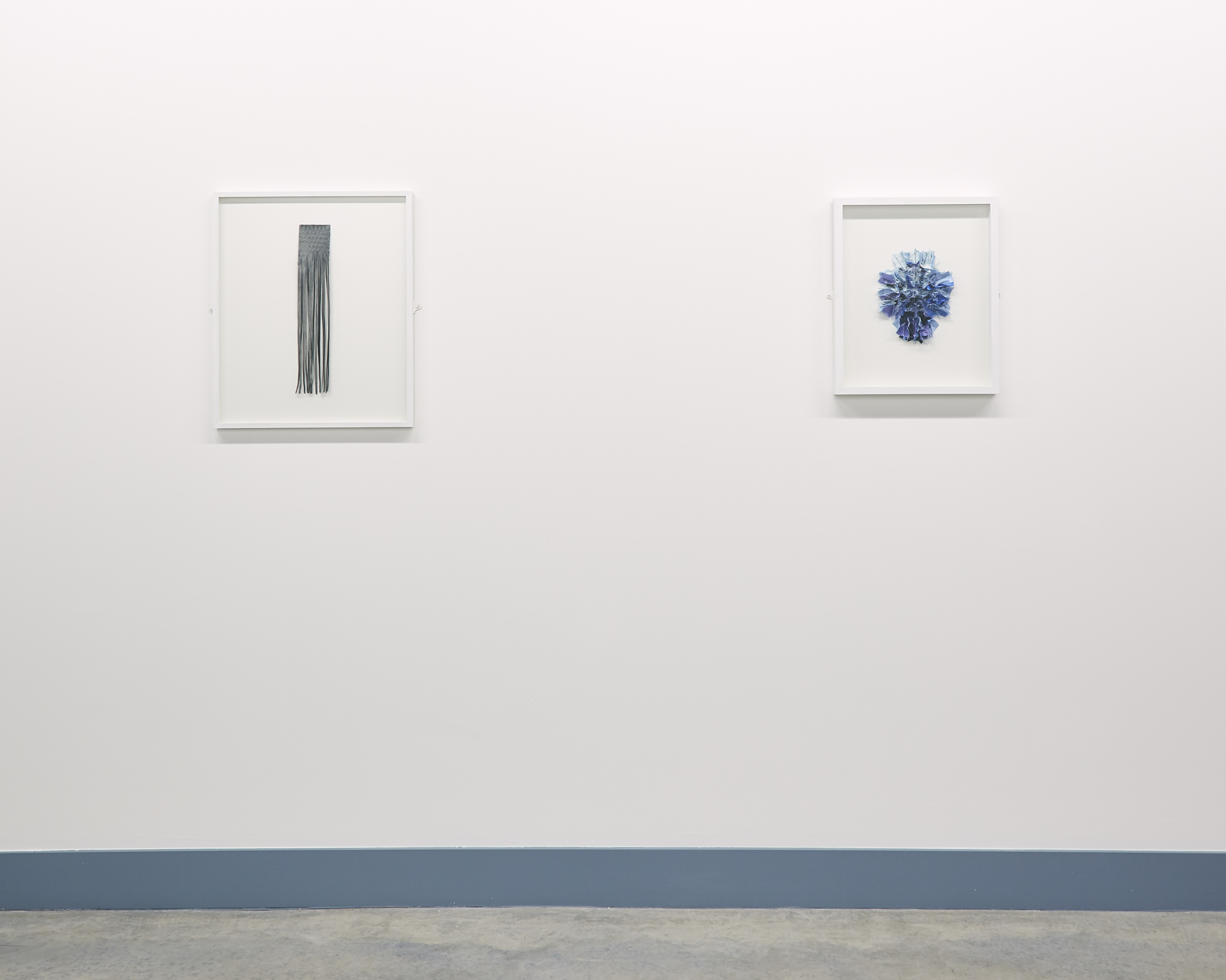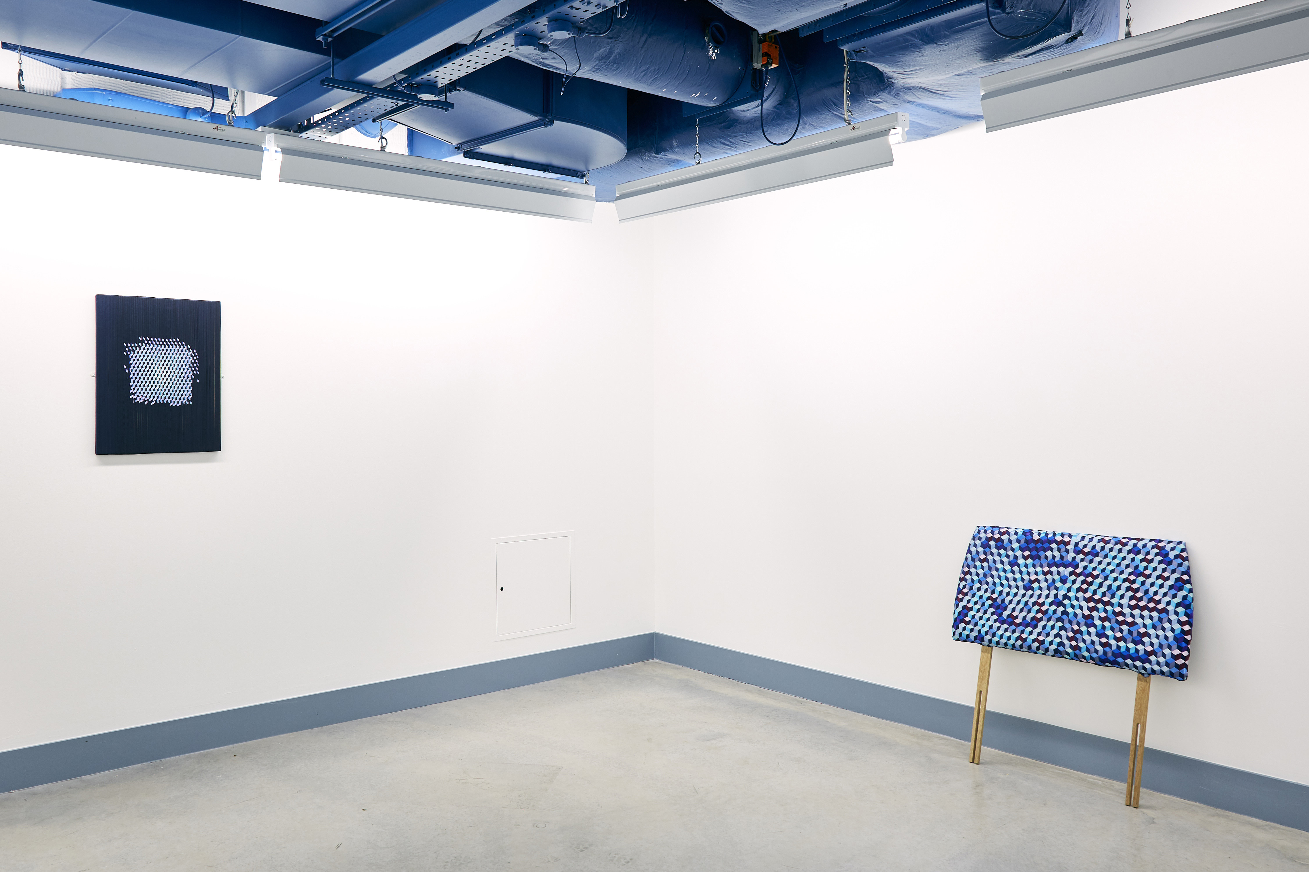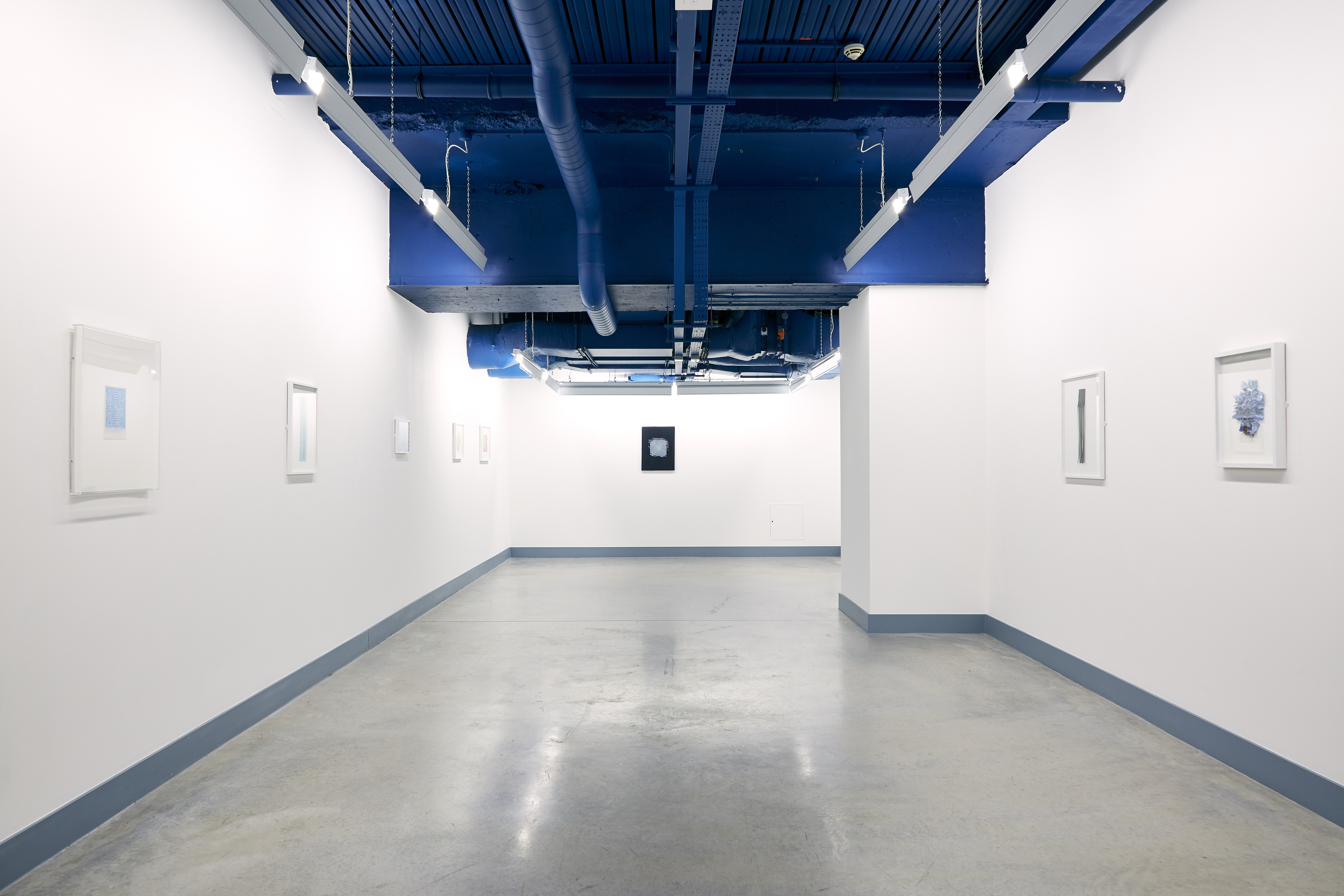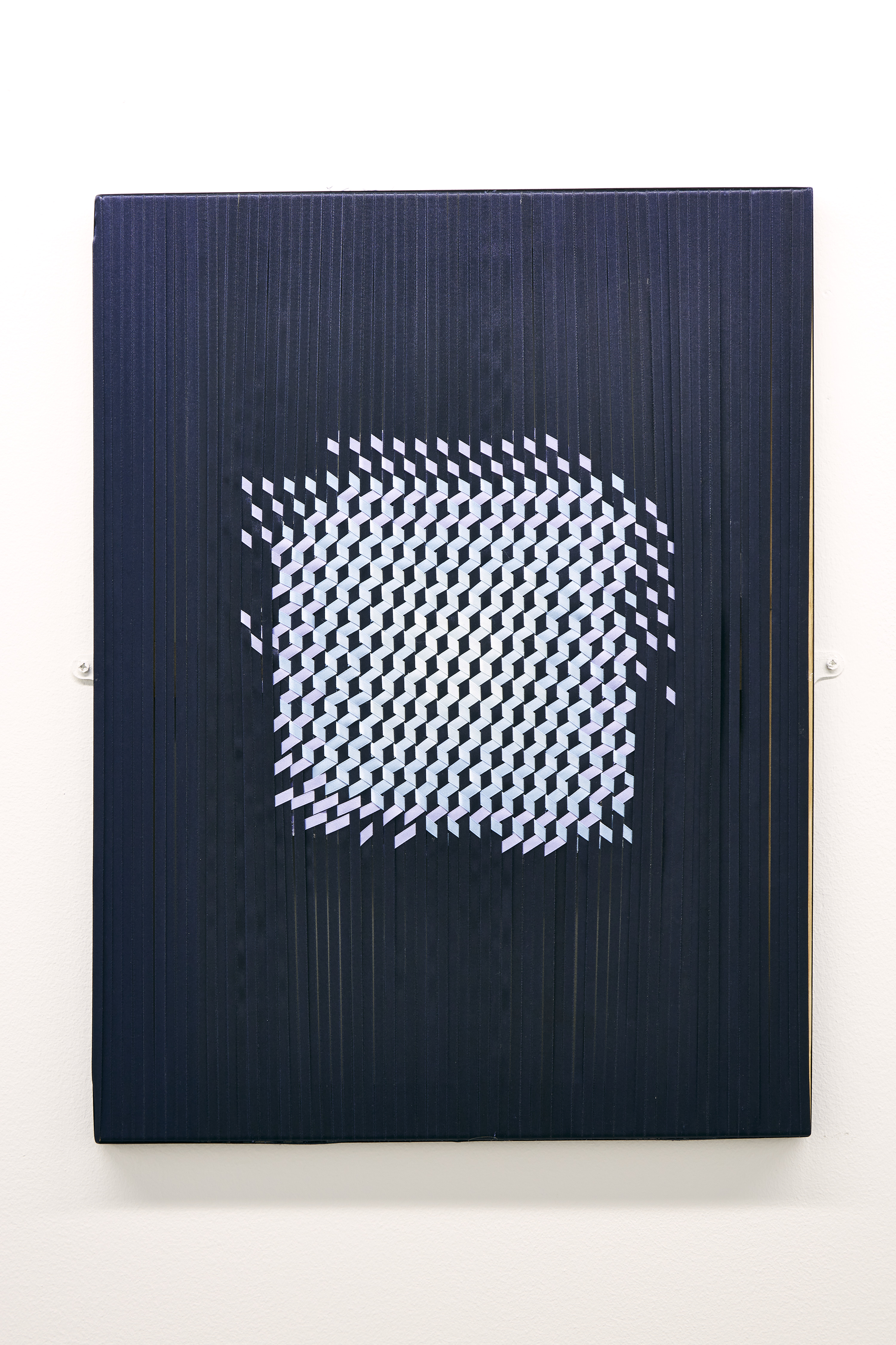 In an essay accompanying the exhibition, Lucie McLaughlin observes: “Instead of conceptualising or attempting to classify McMurray’s work, its unalloyed colour, material control and subject implies formalism balanced with a disintegration through human influence. Where at first the viewer may understand a need for perfection and mathematical beauty, the material choices; stiff yarns, wide ribbon and graphite, drawn marks ‘that tell of process, time and concentration’ reflect imperfectly in flickering lines a ‘tremor of form,’ like the frayed ends of Ode To Irma Blank or the uneven ink surfaces in Blue Cutcomb. Using mathematics as a process of drawing, and a reconstituting of drawing as process to practice, McMurray’s ‘interaction between mind and object, or idea’ arranges the components of mental fabric directed at the impossibility of imagining a fixed goal, therefore uncovering an abstract completeness or absolute.”
