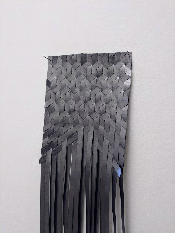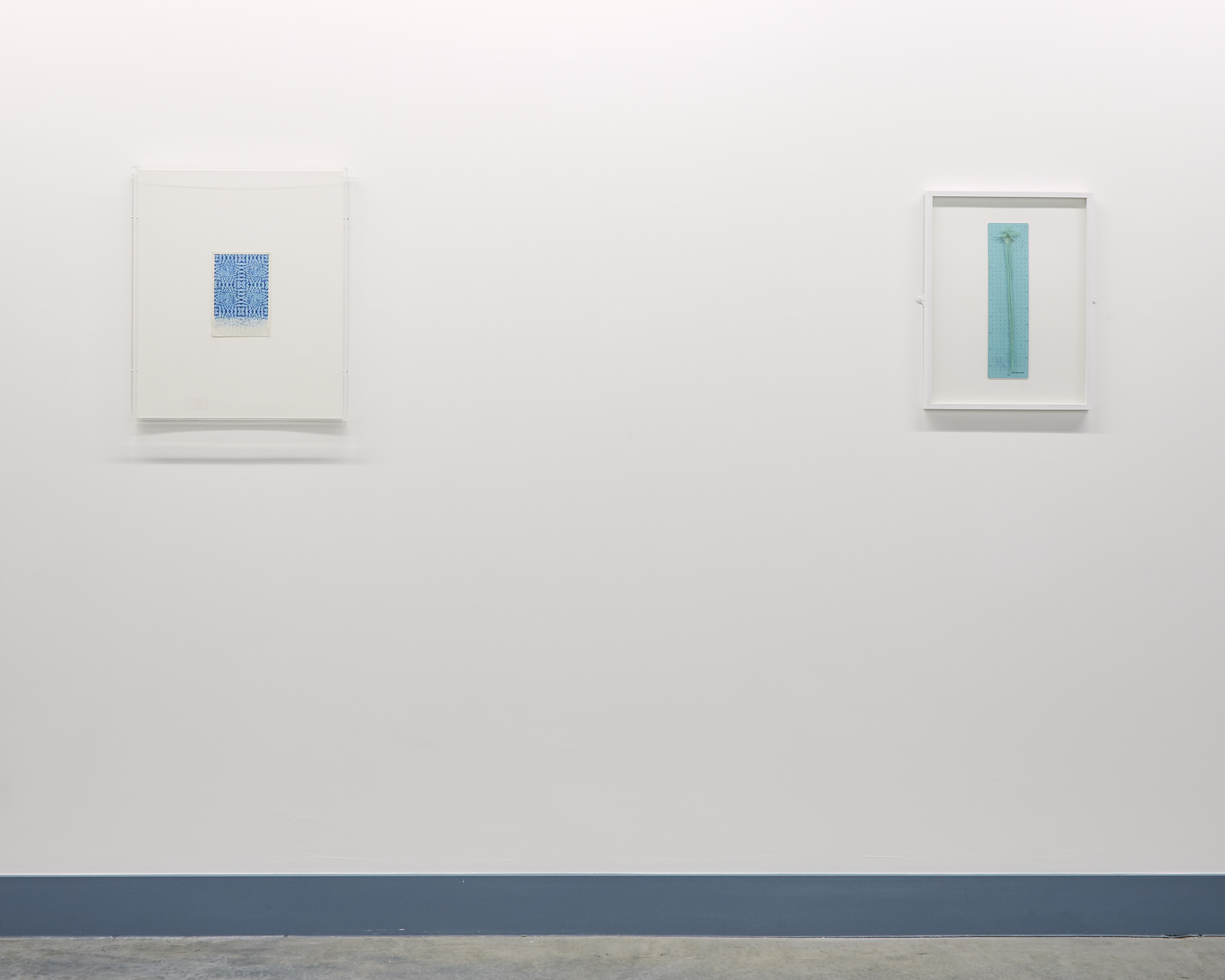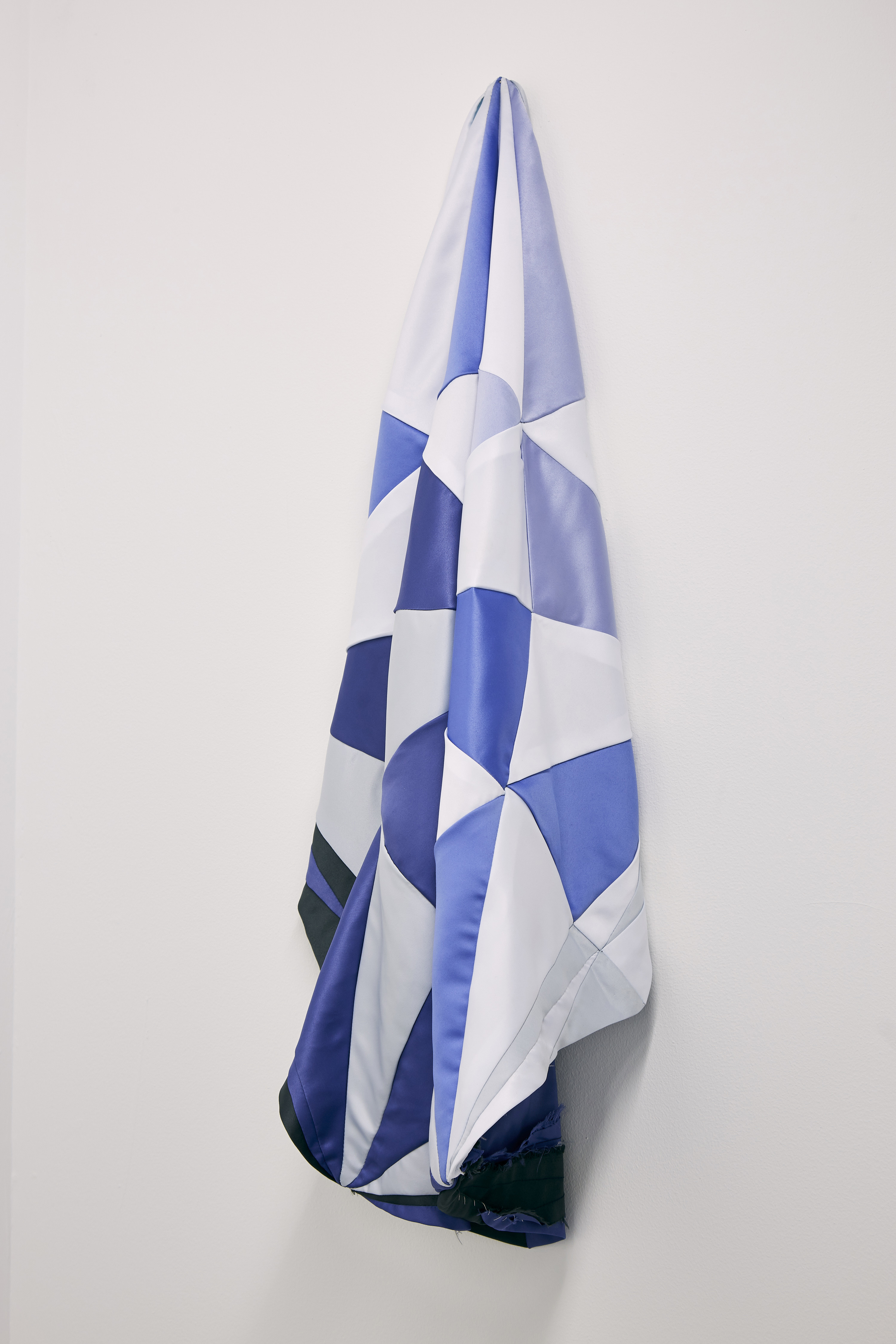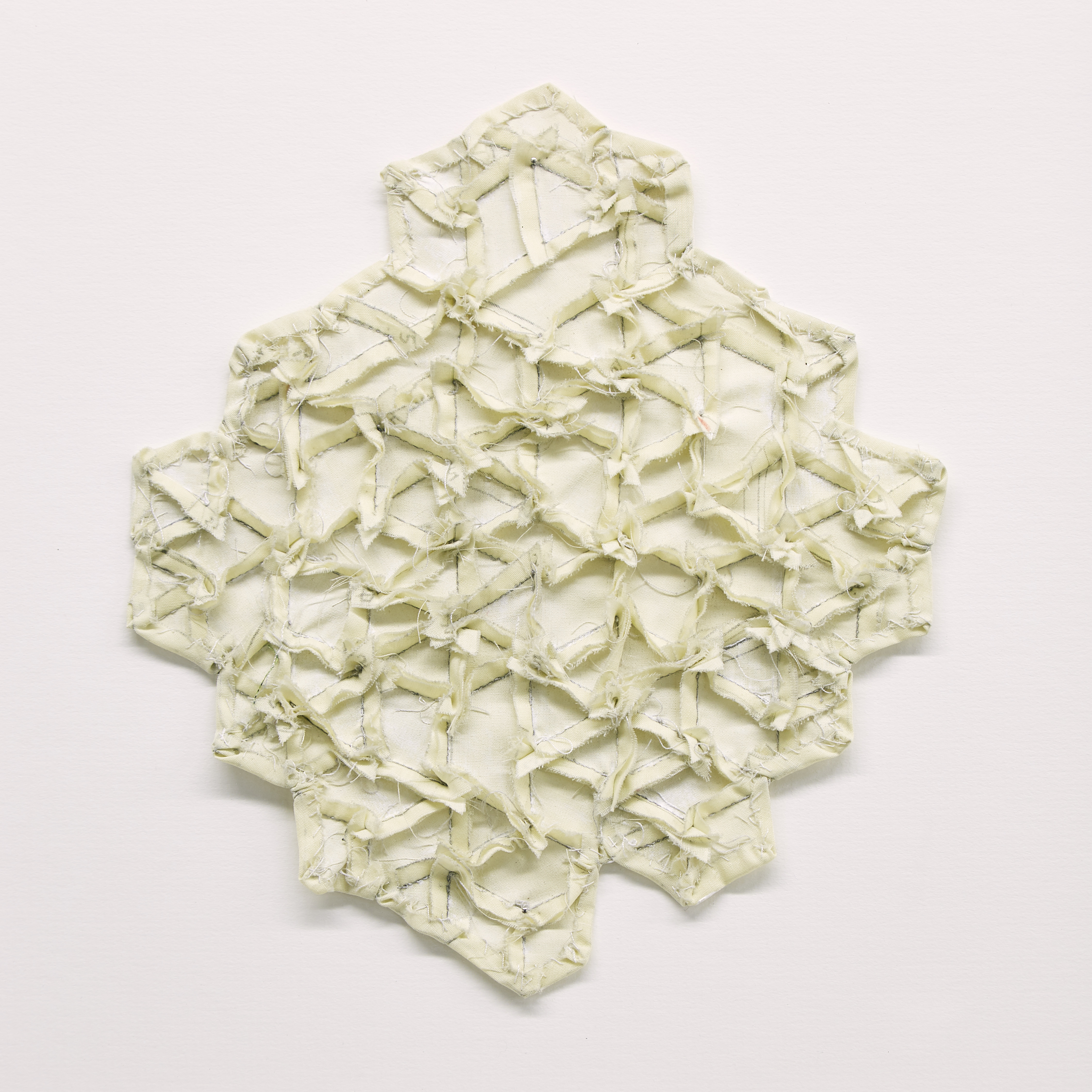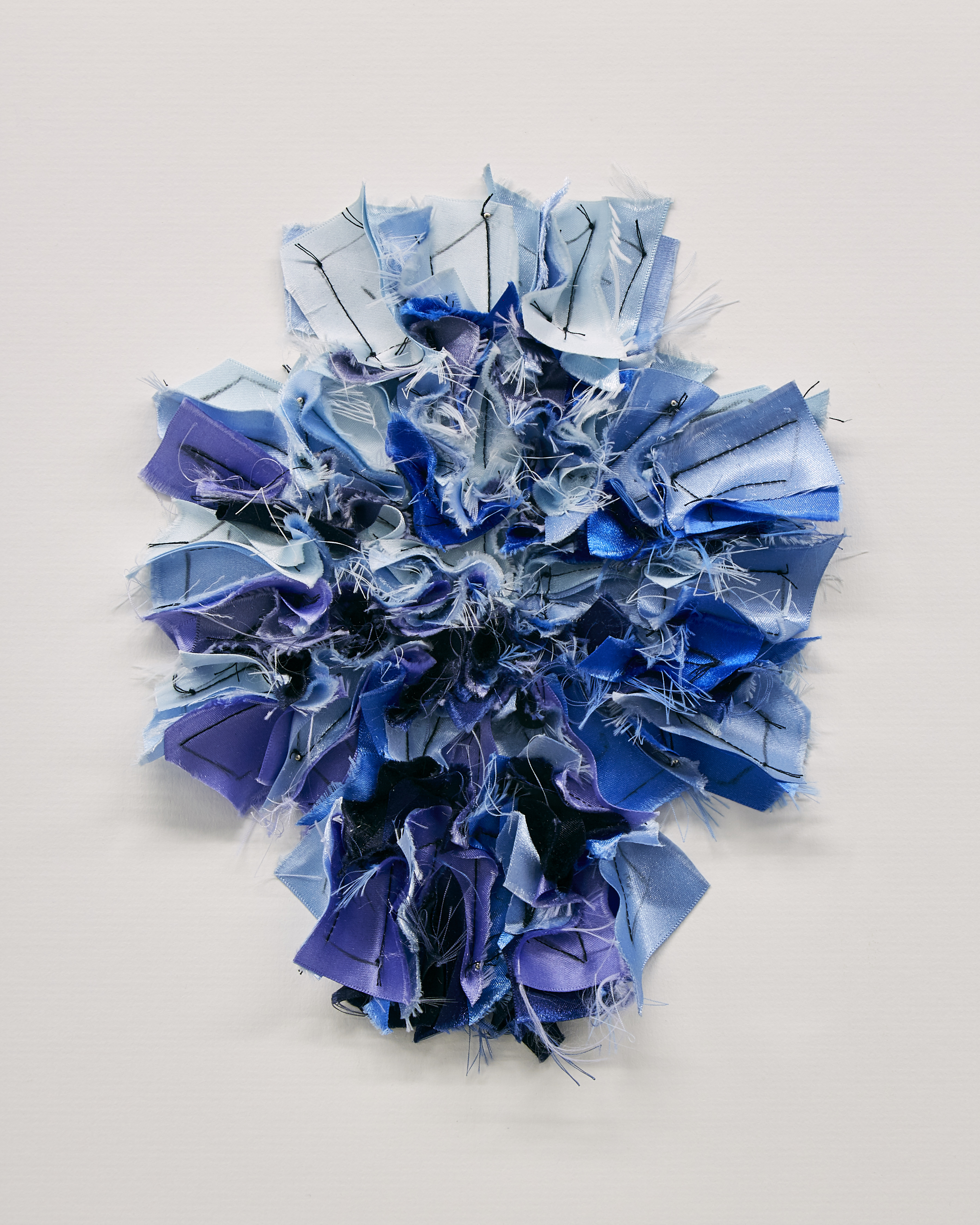 In an essay accompanying the exhibition, Lucie McLaughlin observes: “Instead of conceptualising or attempting to classify McMurray’s work, its unalloyed colour, material control and subject implies formalism balanced with a disintegration through human influence. Where at first the viewer may understand a need for perfection and mathematical beauty, the material choices; stiff yarns, wide ribbon and graphite, drawn marks ‘that tell of process, time and concentration’ reflect imperfectly in flickering lines a ‘tremor of form,’ like the frayed ends of Ode To Irma Blank or the uneven ink surfaces in Blue Cutcomb. Using mathematics as a process of drawing, and a reconstituting of drawing as process to practice, McMurray’s ‘interaction between mind and object, or idea’ arranges the components of mental fabric directed at the impossibility of imagining a fixed goal, therefore uncovering an abstract completeness or absolute.”